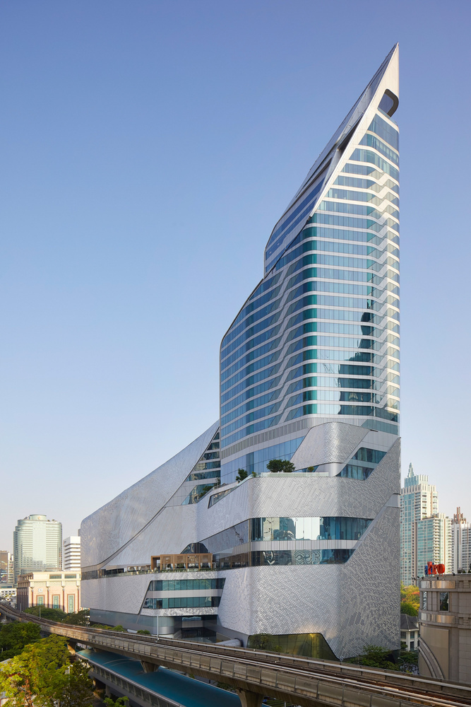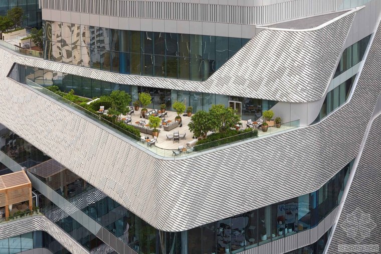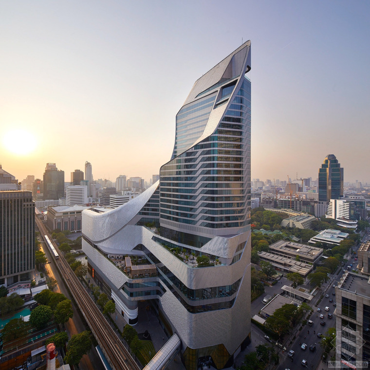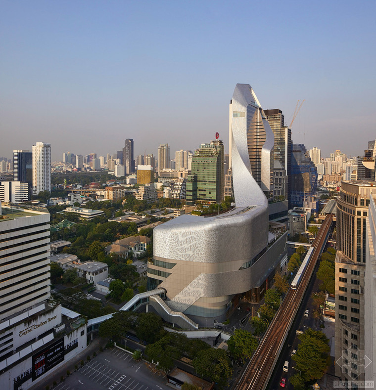 曼谷中心大使館為曼谷這座城市帶來了全新的印象,無論是從街道還是從天際線來看,它都展示出一種邀請(qǐng)的姿態(tài),歡迎曼谷人和全世界人來參觀。項(xiàng)目位于之前英國(guó)大使館的花園中,沿著曼谷最重要的商業(yè)干道 Ploenchit 大路,占地150萬平方英尺(約139萬平方米)的綜合體包括一個(gè)7層的奢侈品零售區(qū)和27層的五星級(jí) Hyatt 酒店塔樓。這座塔是第一個(gè)英國(guó)建筑師在泰國(guó)完成的項(xiàng)目。酒店和購(gòu)物中心使用連續(xù)循環(huán)的形式,使裙房和塔樓更直接的結(jié)合在一起。塔樓連續(xù)的線條似乎打破了裙房的大體量,在尺度上創(chuàng)造了一種非對(duì)稱的結(jié)構(gòu)。這種形式的開放,包容了城市并且建立了一種相互的視野,一系列的室外平臺(tái)和露臺(tái)可以看到彼此。兩個(gè)垂直的光井,完全的打開塔樓內(nèi)部空間,可以看到層層疊疊不斷向上變化的平臺(tái),同時(shí)這些平臺(tái)又劃分了酒店的功能:面對(duì) Nai Lert 公園的私人會(huì)客空間、酒吧、接待休息室和面向市中心的天臺(tái)。