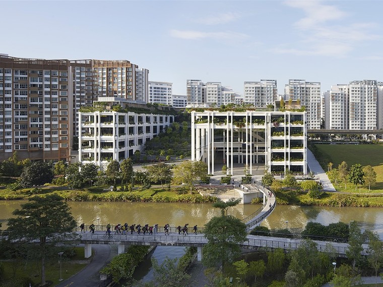 朝向水岸的風(fēng)雨廣場是社區(qū)中充滿活力的核心地帶,可以用于各種類型的社區(qū)活動和事件。廣場連接了貫穿場地的東西向和南北向道路,同時與附近的Oasis輕軌站相連接,從而成為社區(qū)中重要的交通節(jié)點。建筑的每個立面都充斥著綠植,與環(huán)繞在餐廳和醫(yī)院外部的涼廊共同在室內(nèi)和室外之間形成一層“濾網(wǎng)”,使陽光和自然風(fēng)柔和地透入內(nèi)部空間,從而讓整個建筑呈現(xiàn)出一種輕盈而開放的感覺。思銳建筑事務(wù)所的主創(chuàng)建筑師Christopher Lee表示:“我們的設(shè)計借鑒了新加坡住房和發(fā)展委員會在上世紀(jì)70-80年代開發(fā)的住宅建筑中常見的開放式框架,并基于景觀環(huán)境將這種框架轉(zhuǎn)變?yōu)橐粋€更加輕盈和開放的、能夠捕捉和容納各類社區(qū)功能的系統(tǒng)——這是一座為社區(qū)生活的展開而打造的建筑。”